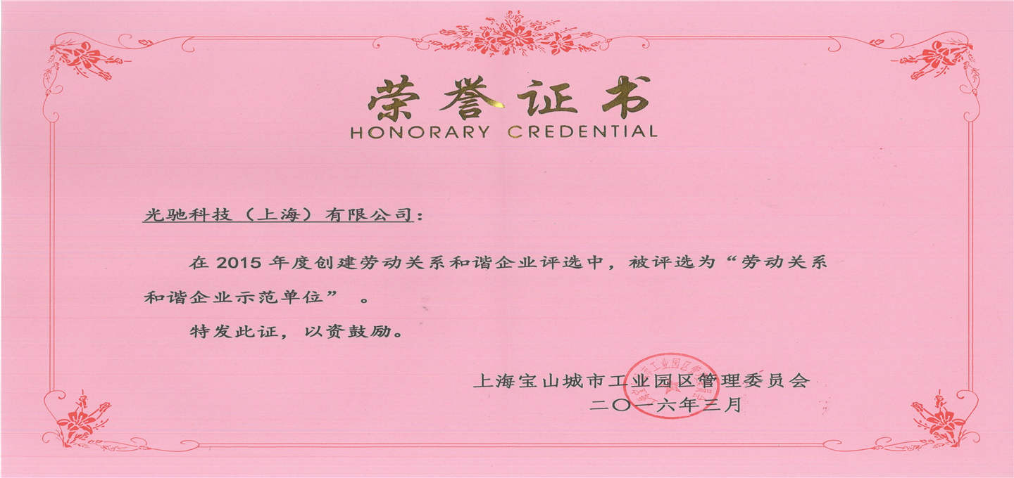 榮獲”2015年度寶山城市工業(yè)園區(qū)勞動(dòng)關(guān)系和諧企業(yè)“